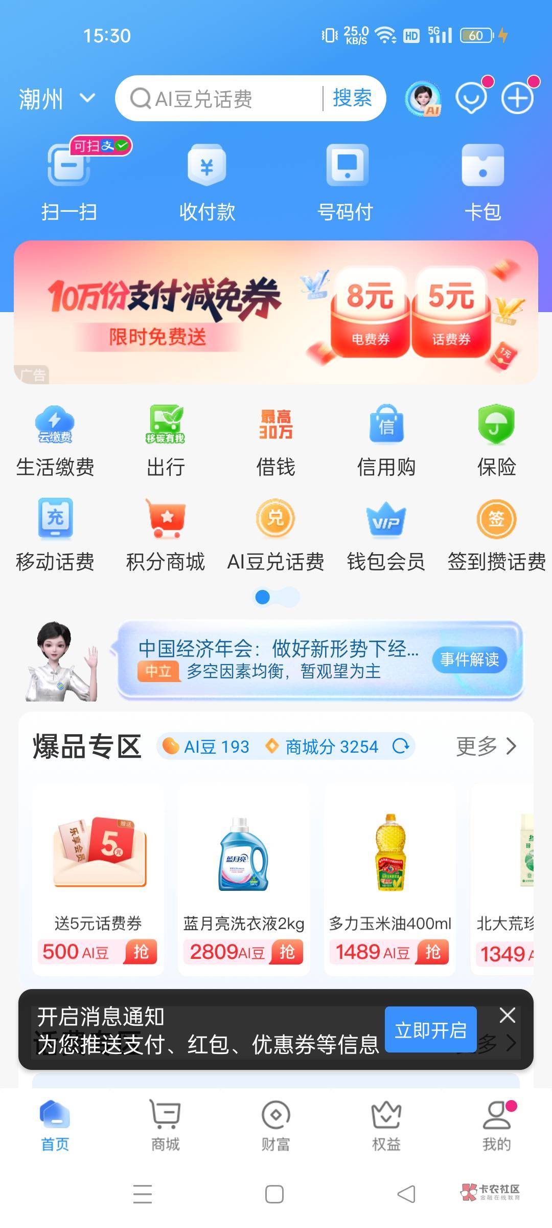 vx支付有优惠,3个金币换移动1块花费
