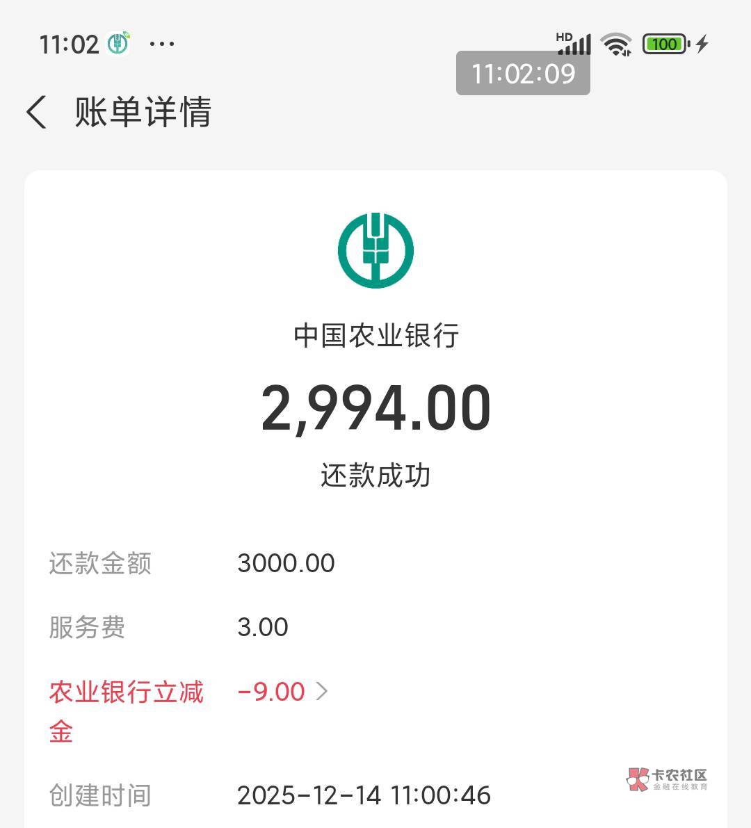 湖南农行电子二类,支付宝信用卡还款3000-9,扣除手续费3元润6