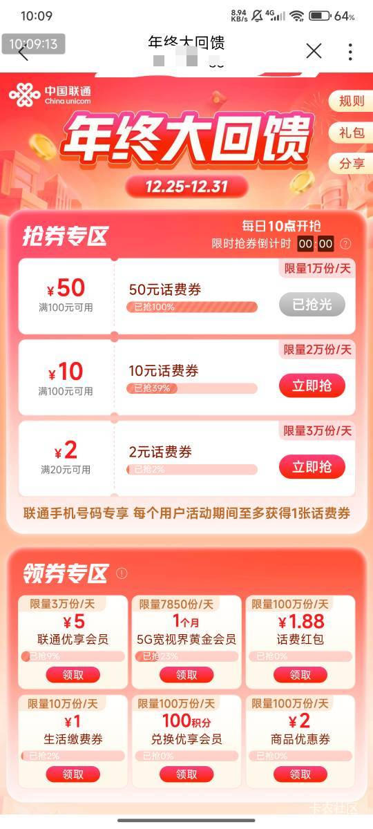 联通app,年终大回馈,25号开始,每天10点抢话费卷! ...