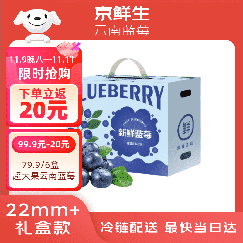 京鲜生云南蓝莓22mm 超大果 拍下99.9亓反20卡 到手6盒