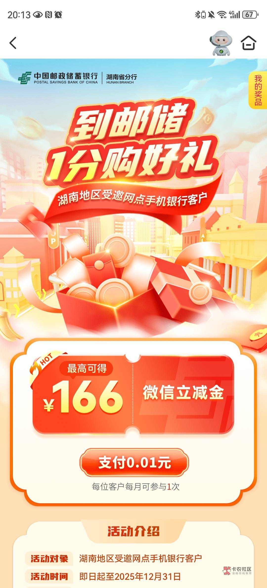 湖南特邀——邮储app——活动——本地独一无二——一分购抽166立减金活动