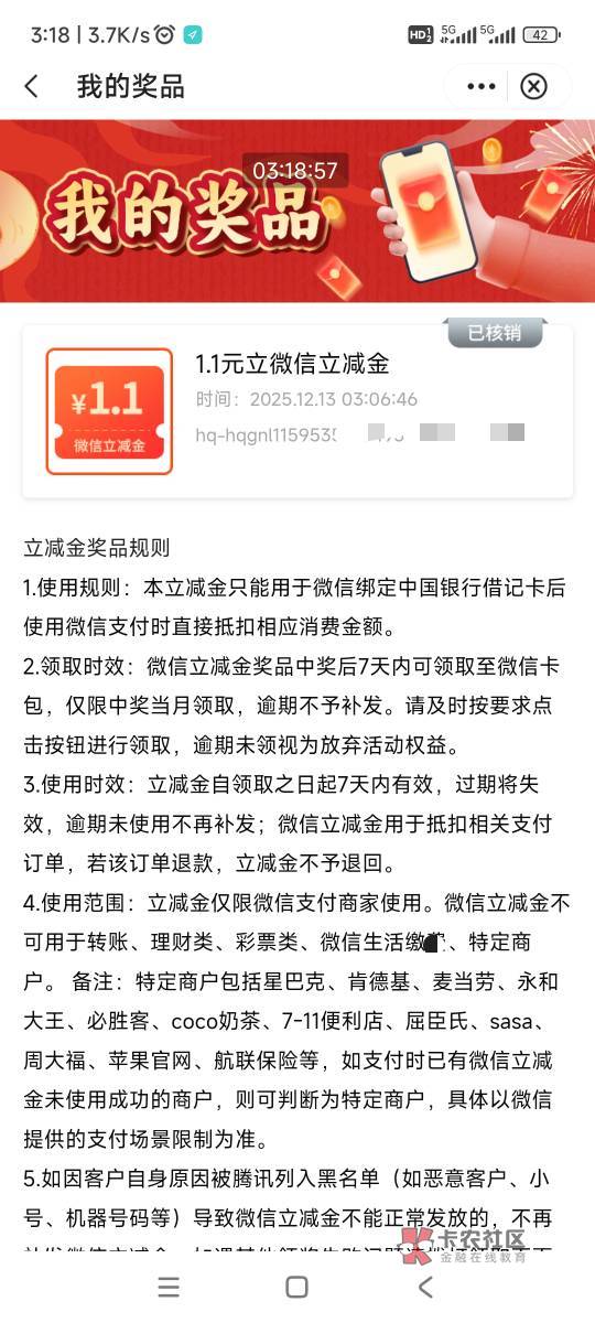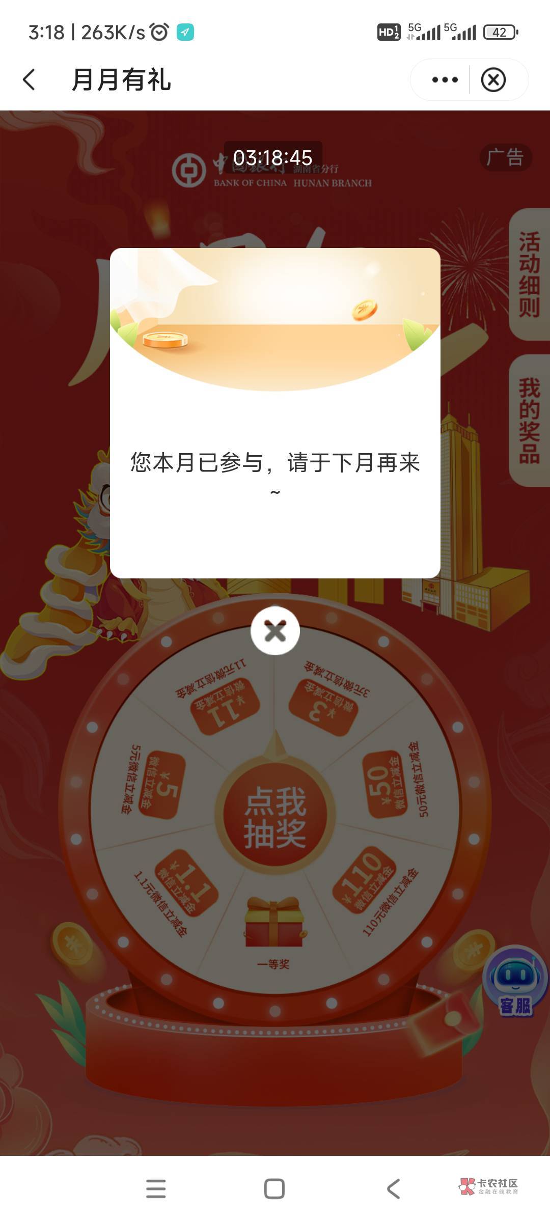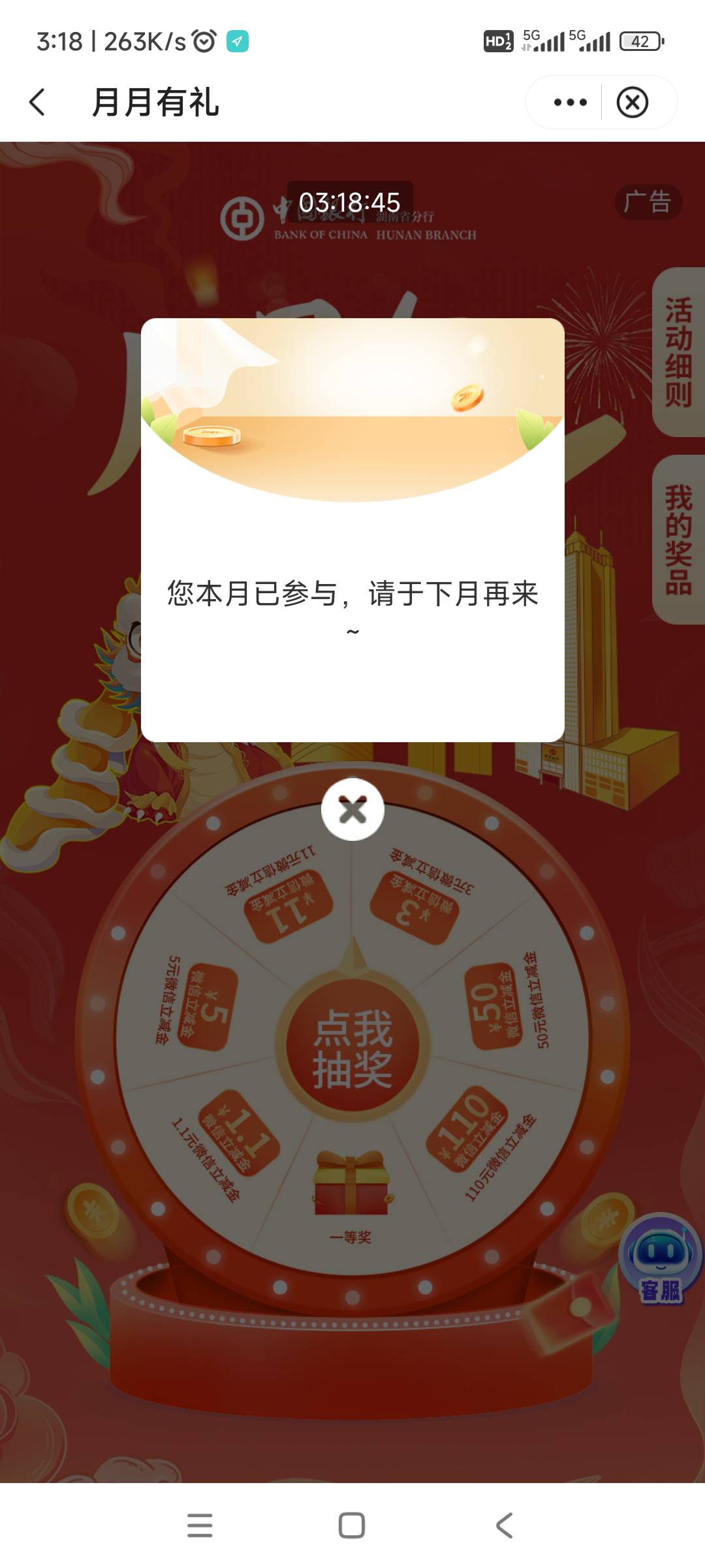 湖南中行 月月有礼、支付0.01抽1.1~110 可惜又是低保