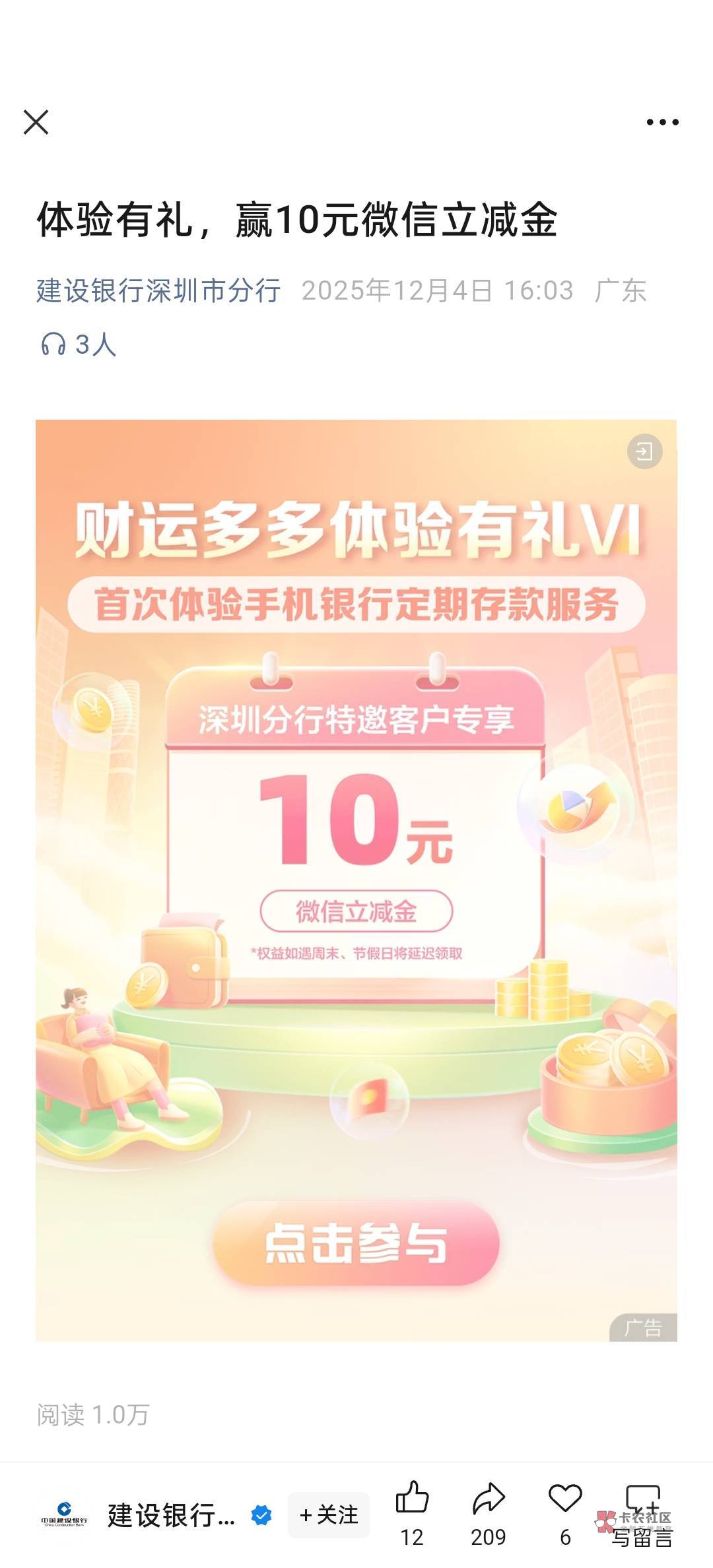 建行的活动,给 10立减金 https://mp.weixin.qq.com/s/poIXACL3061uf9m53BOYSg