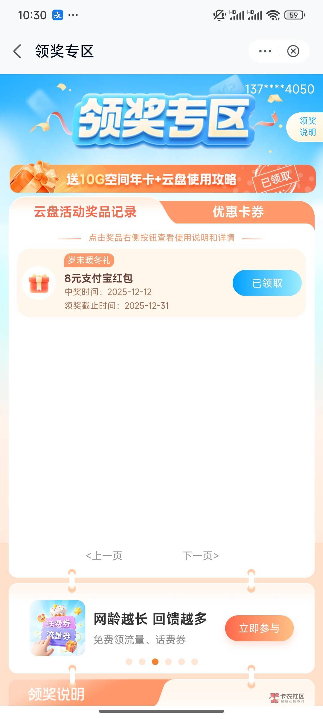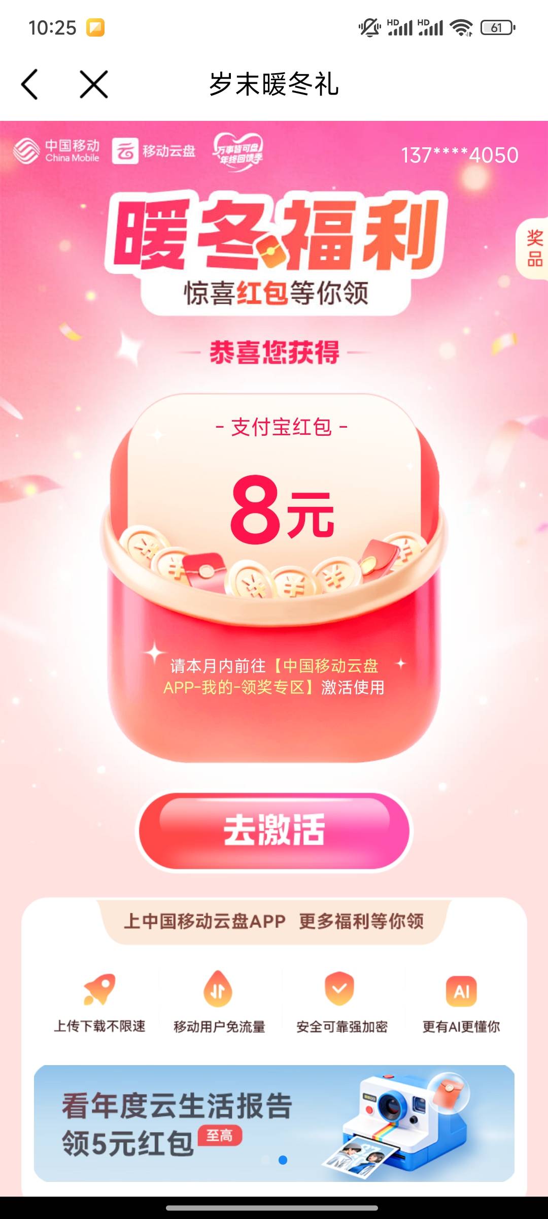 中国移动,岁末寒冬礼,下载移动网盘登录有毛,我已经领到了8毛