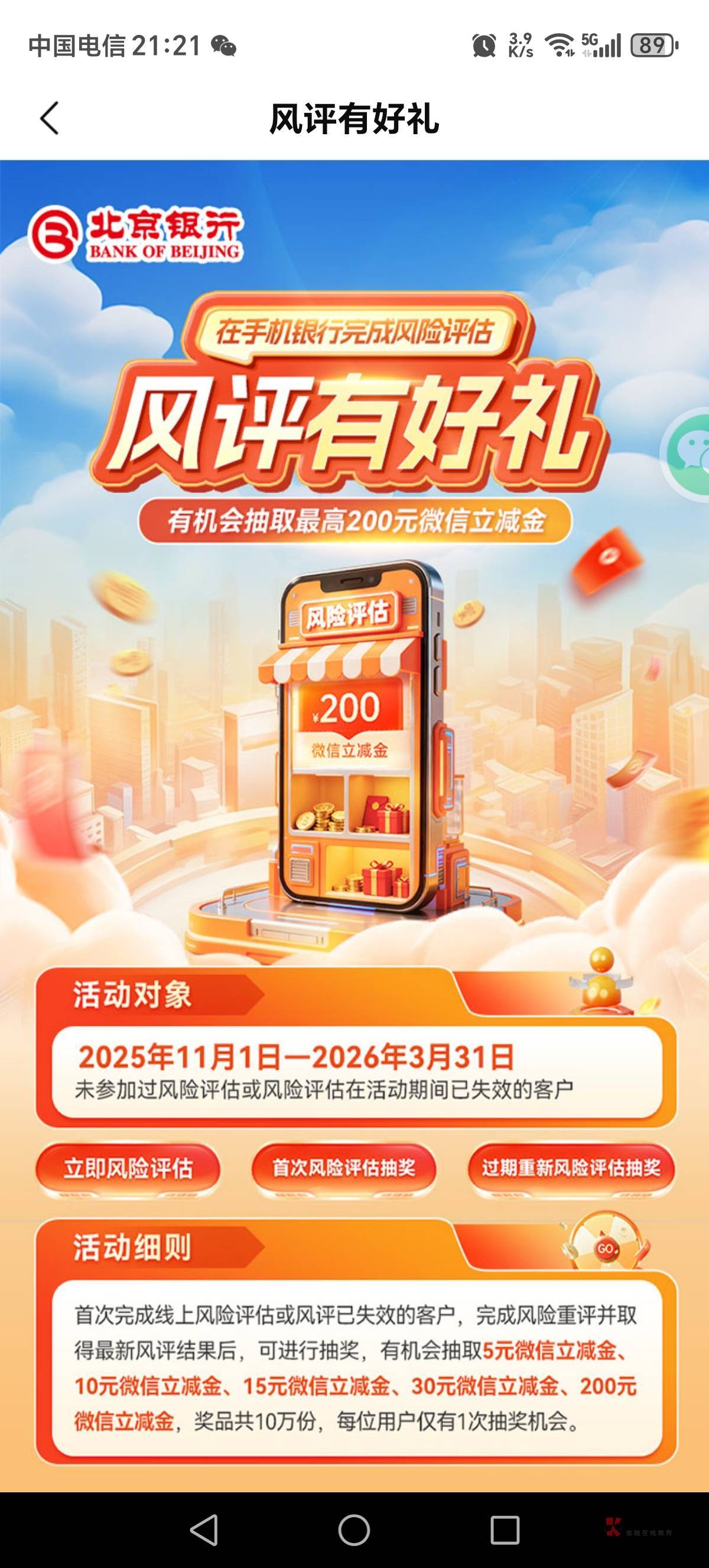 北京银行,热门活动,X+会员,风评抽立减金,大概率应该是5