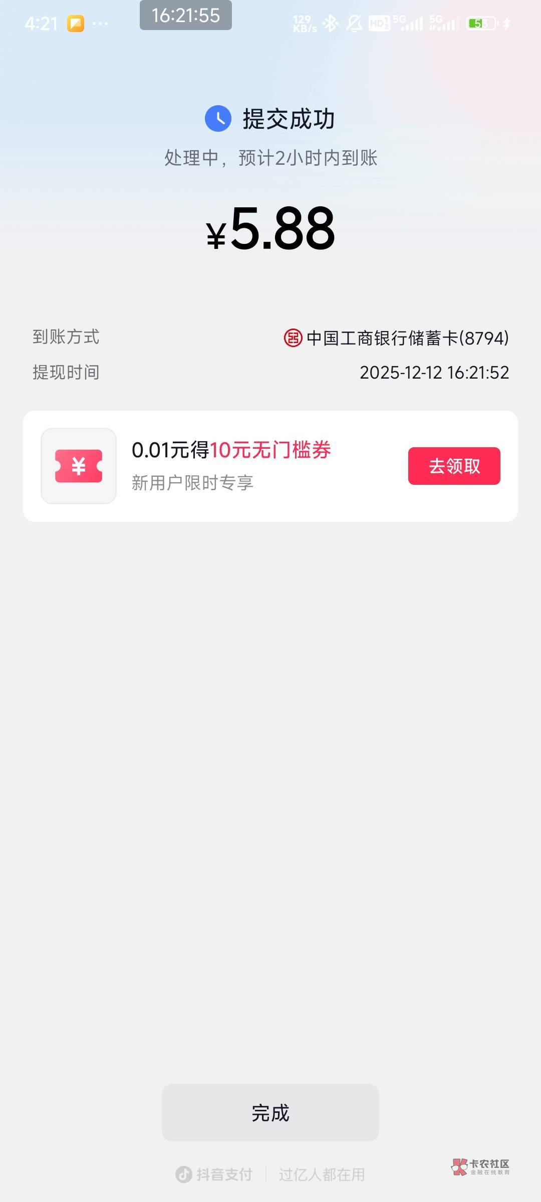 首发,和多号注册抖音点我的钱包有5.88绑卡直接提现到YHK,我是和多号注册的抖音刚才注销了又立马注册,就有5.88