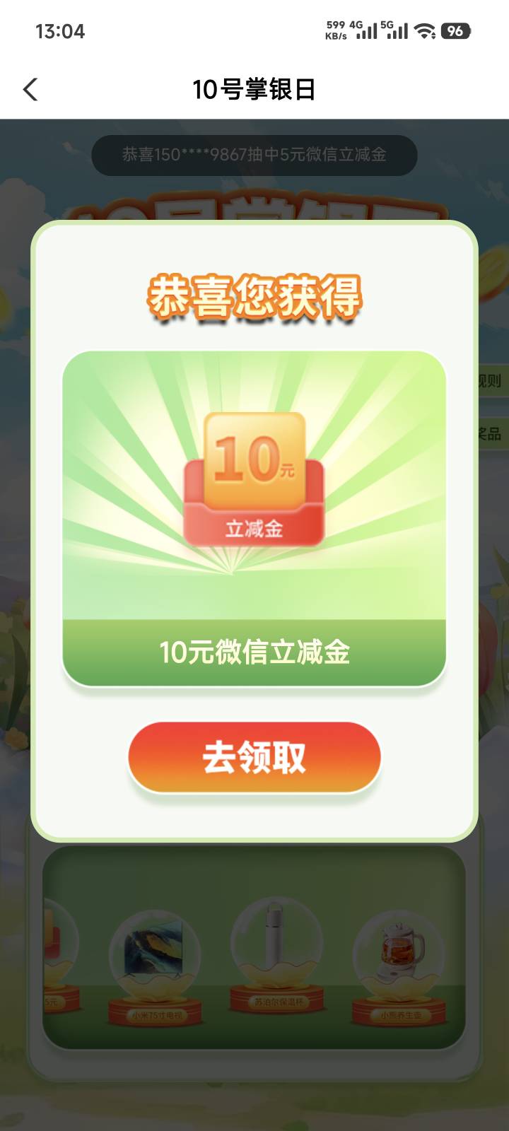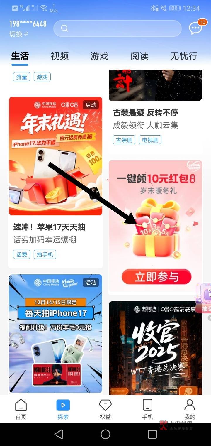 中国移动抽立减金! 登录中国移动app点击探索,往下拉点一键领10元红包。