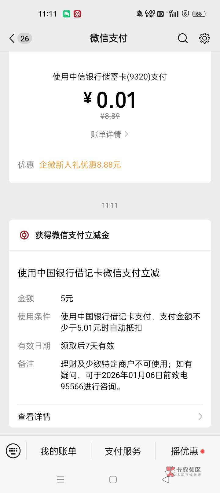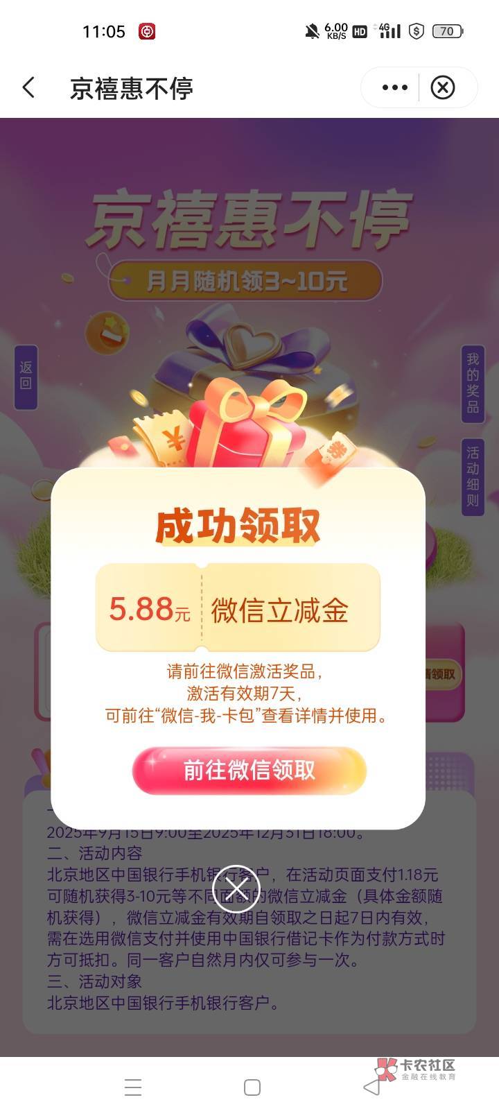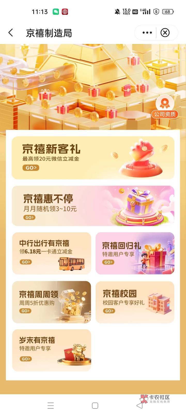 中行北京京喜制造局里面有活动挨个看看,微信首绑中行5立减