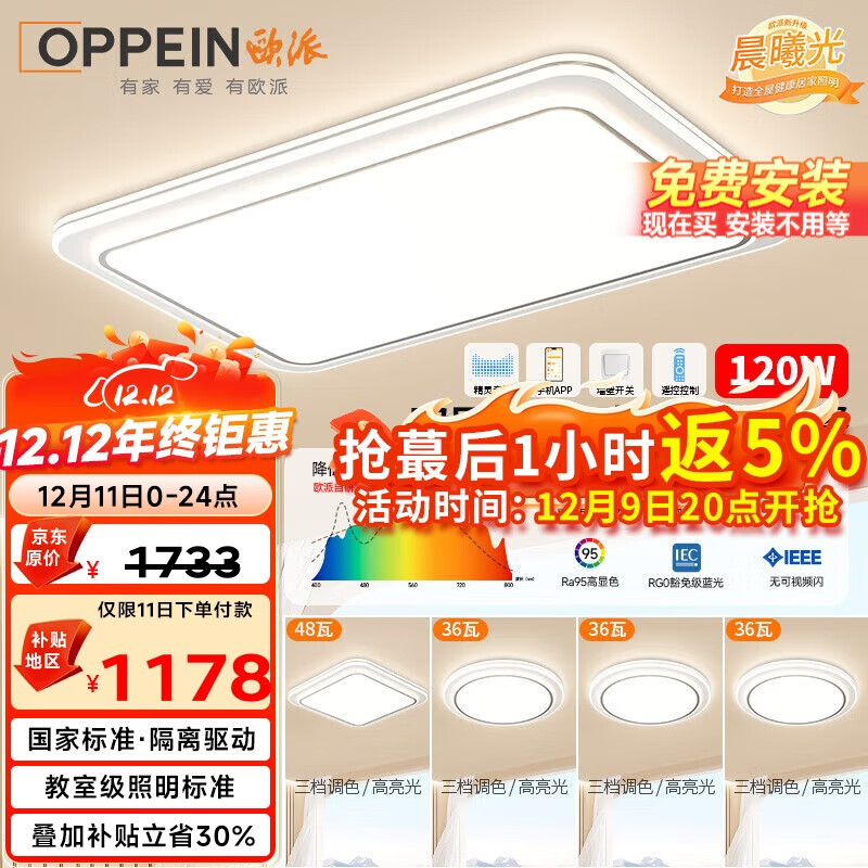 灯饰5折券 欧派(OPPEIN)客厅吸顶灯led全光谱,國补后,430.1