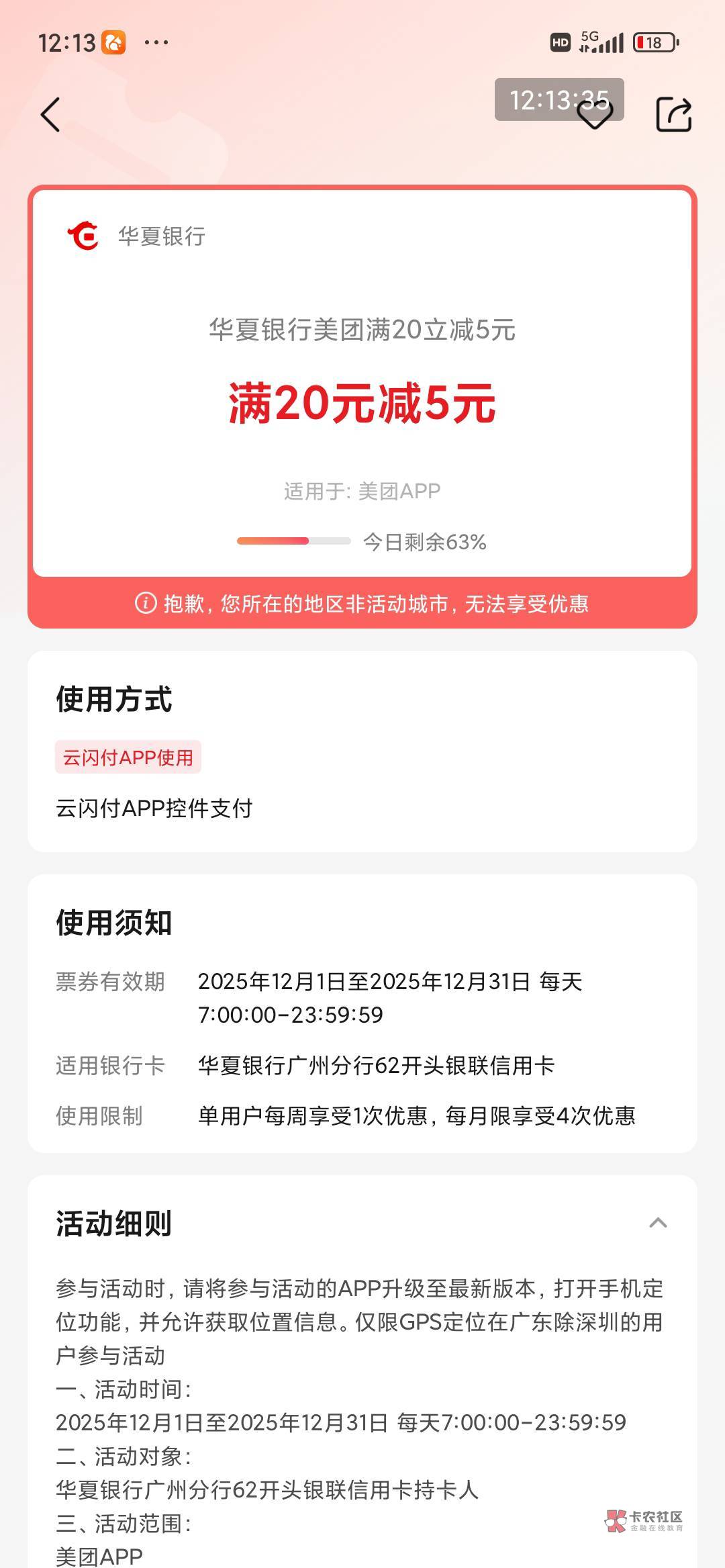 H夏广州分行信用卡,美团20-5一个月4次