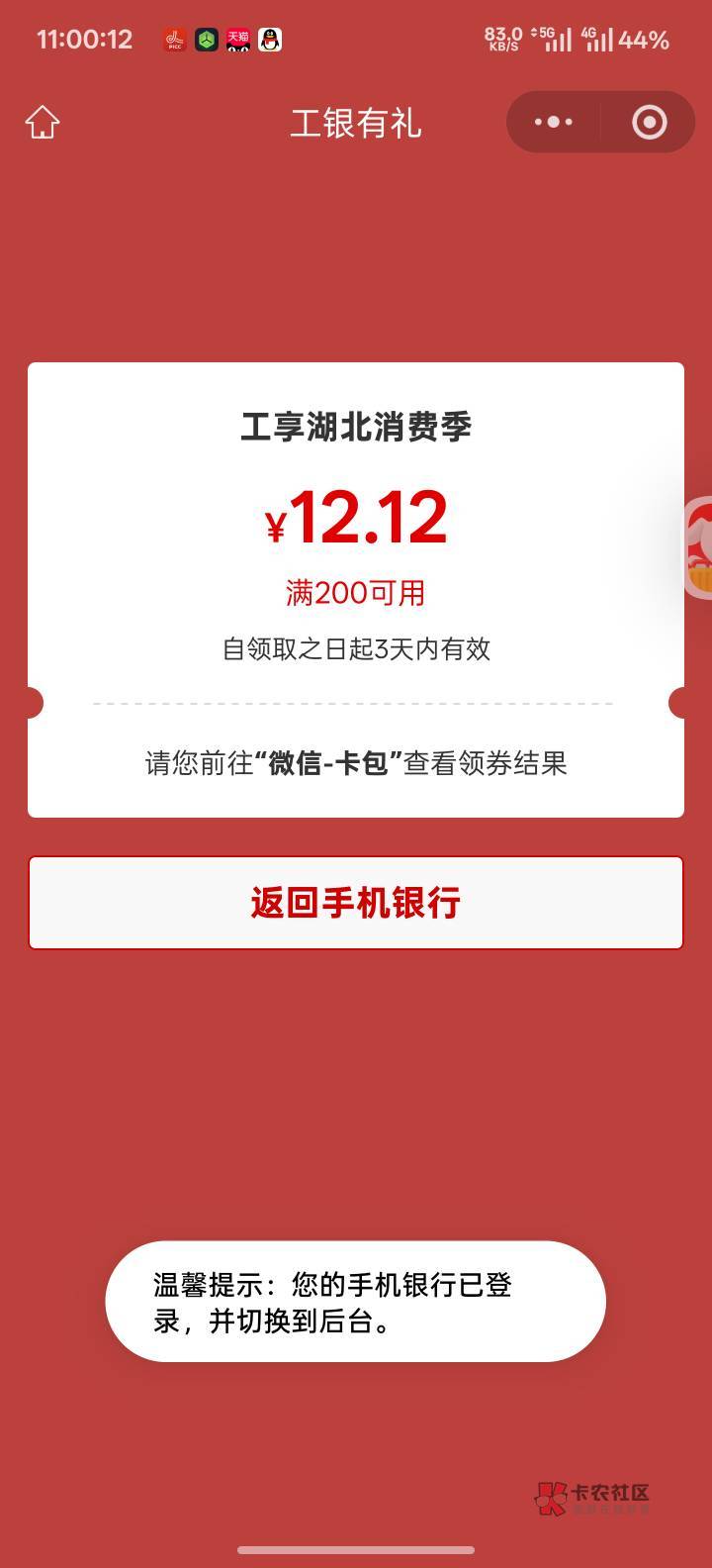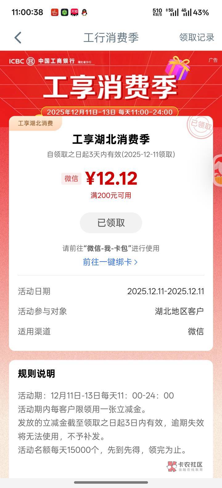 湖北工行消费季12毛二类卡可以