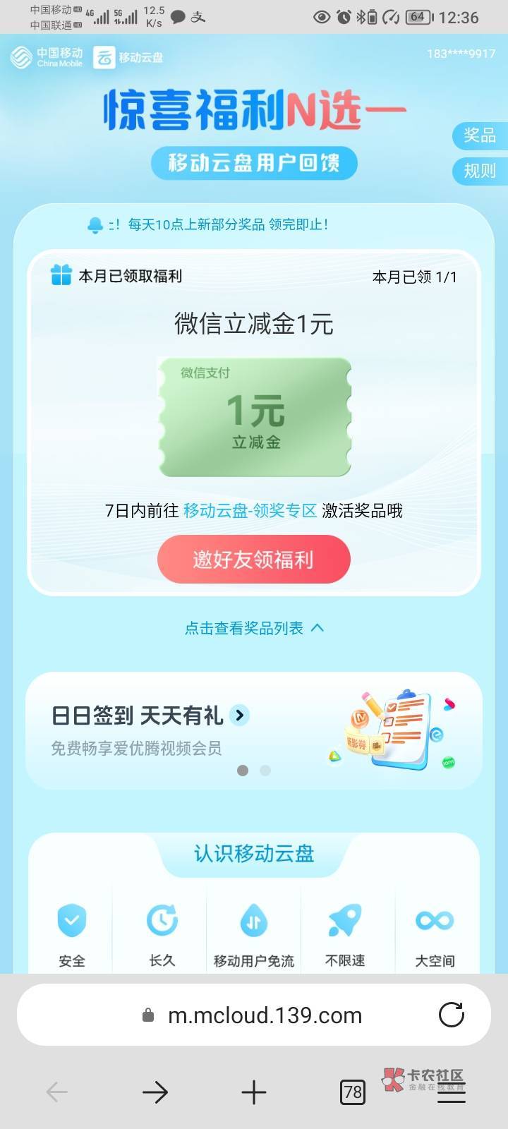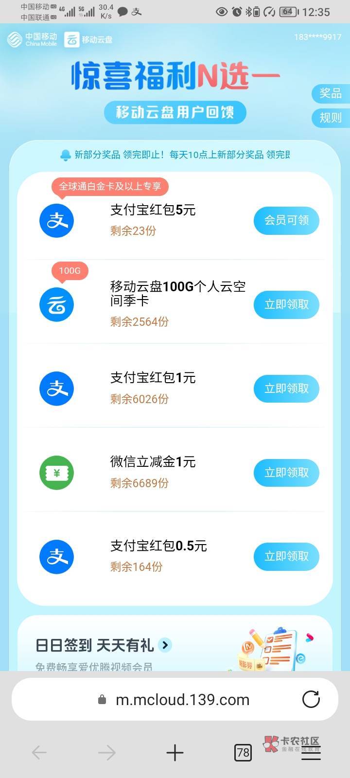 无头,刚收到的短信。【中国移动云盘】云盘好礼回馈,月月登录可领:支付宝红包、云盘