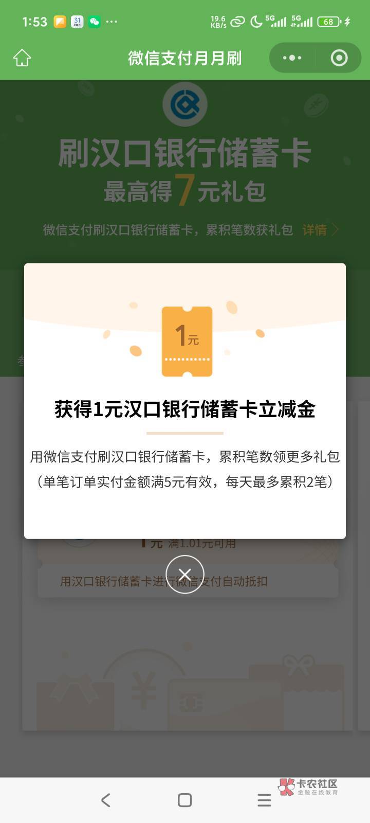 汉口银行微信支付月月刷活动