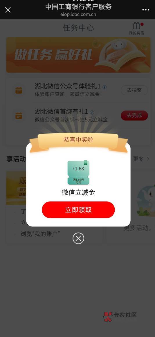 工行任务中心湖北微信公众号体验礼1活动
