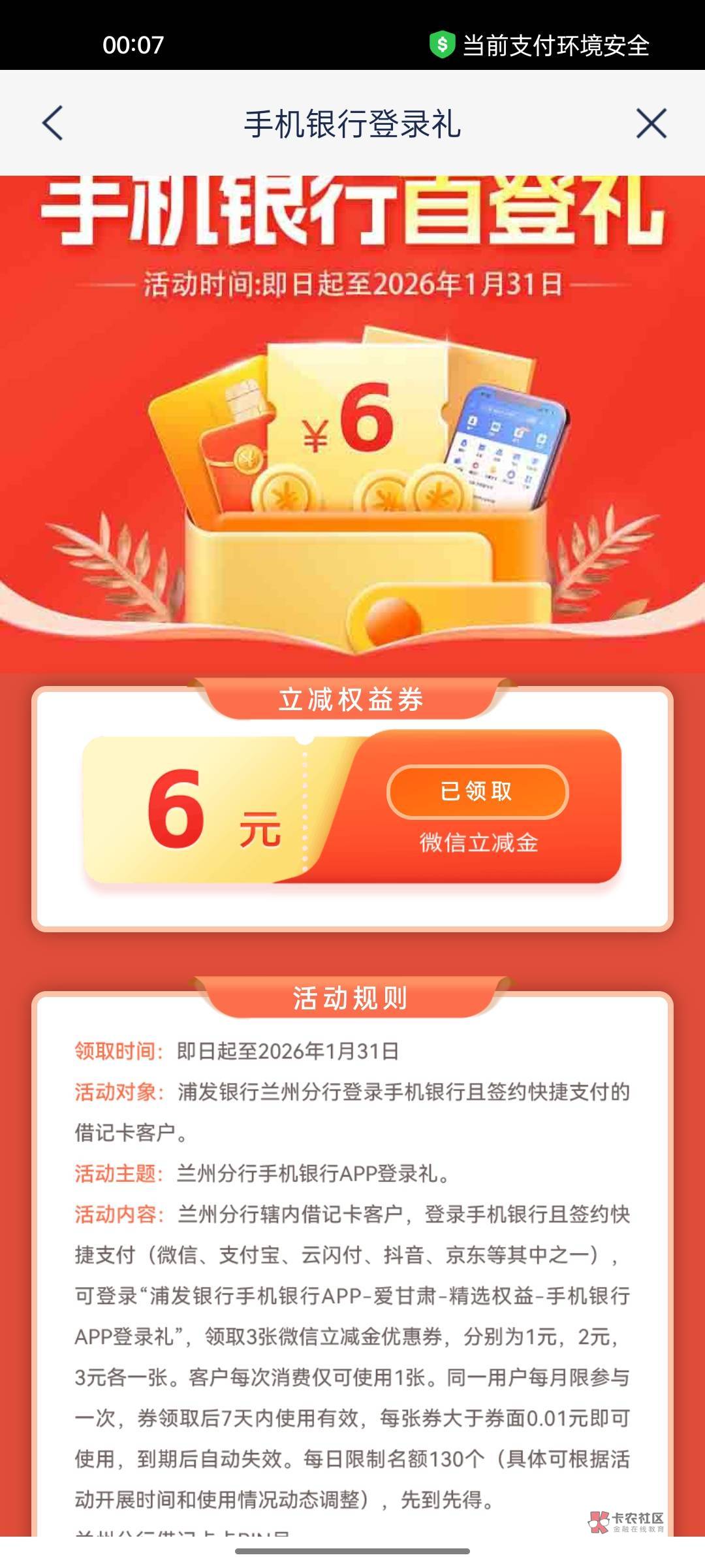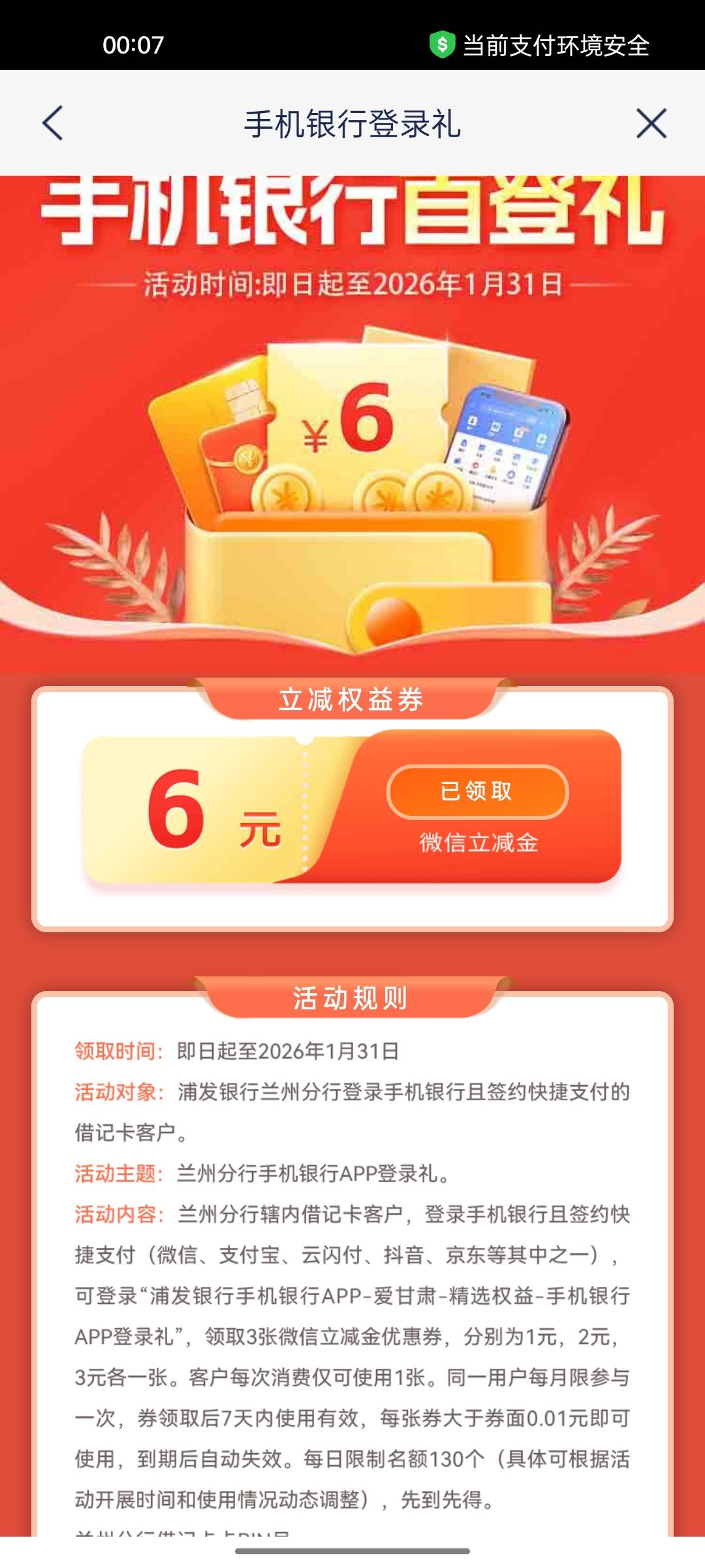 每月必领浦发银行甘肃地区6元