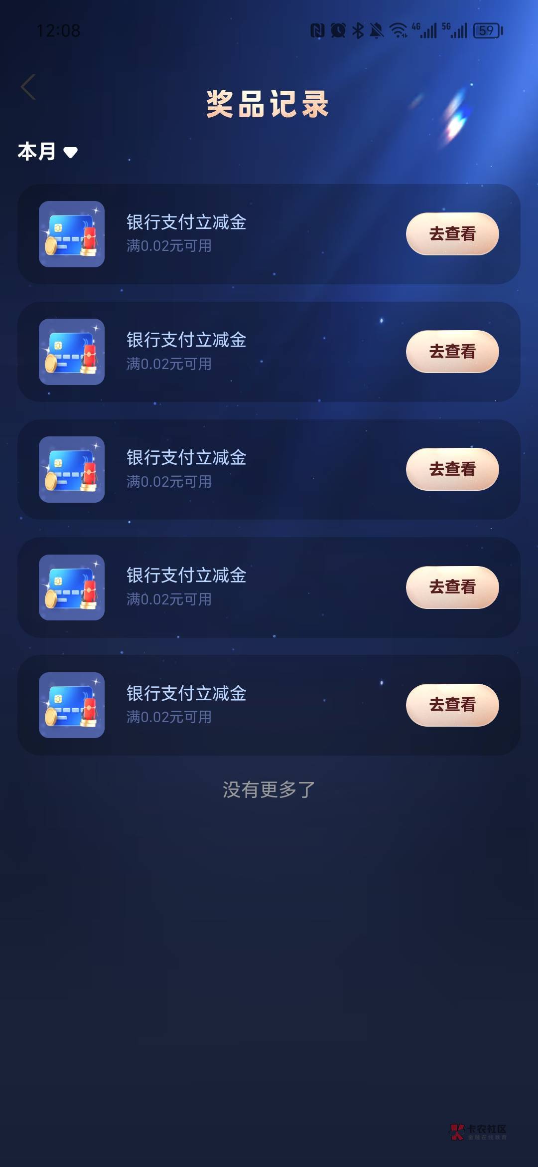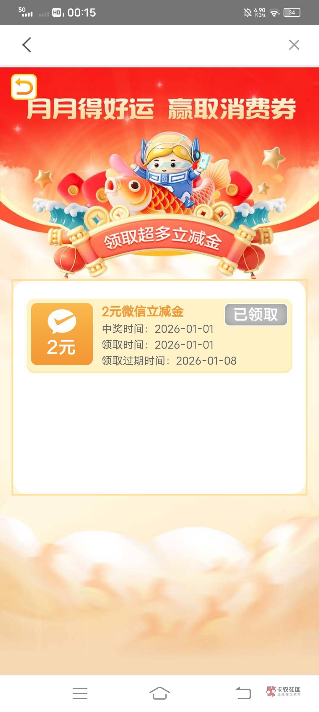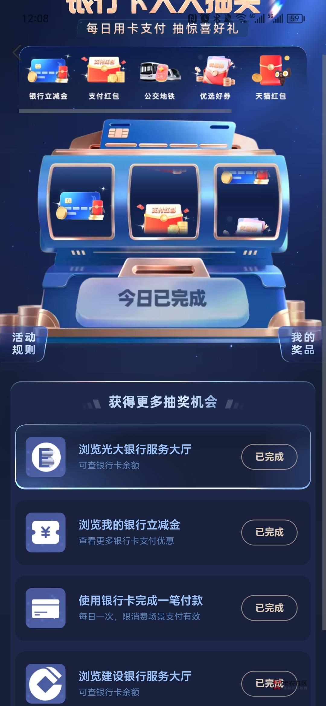 支付宝银行卡抽红包大概5次立减金