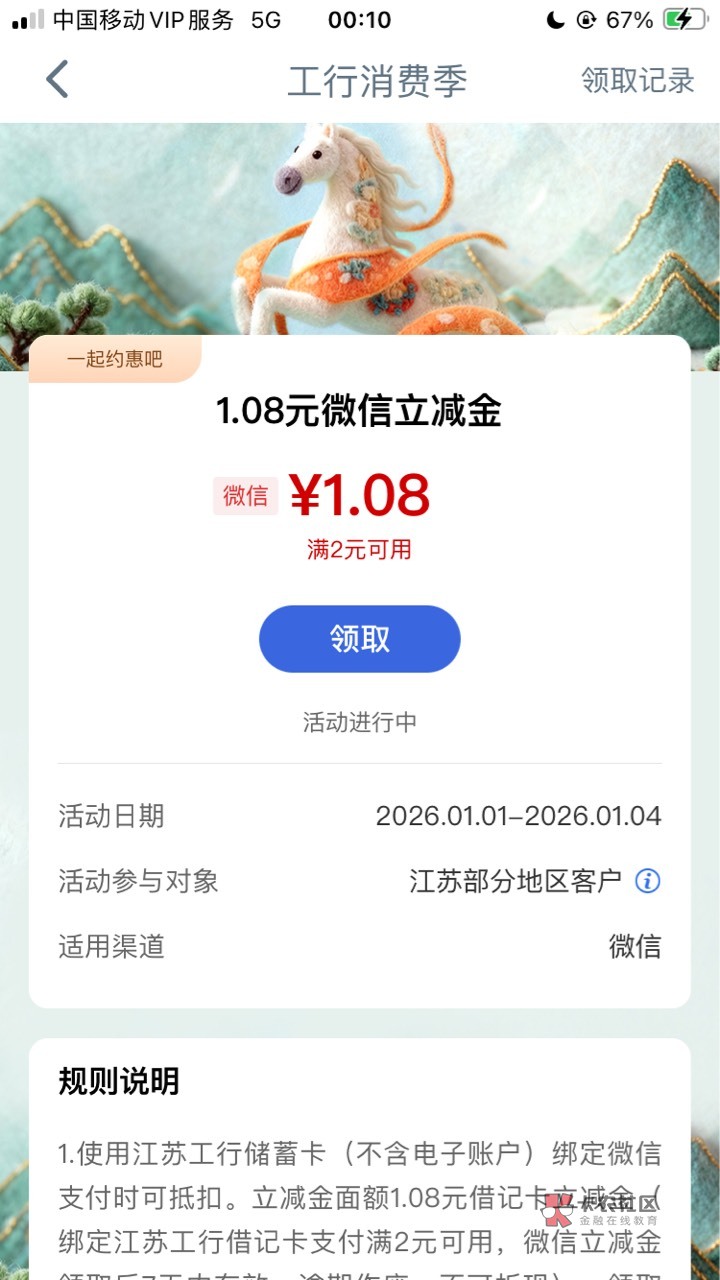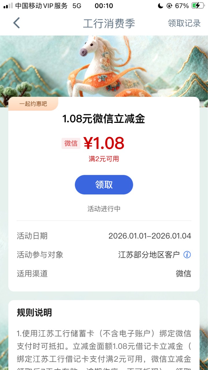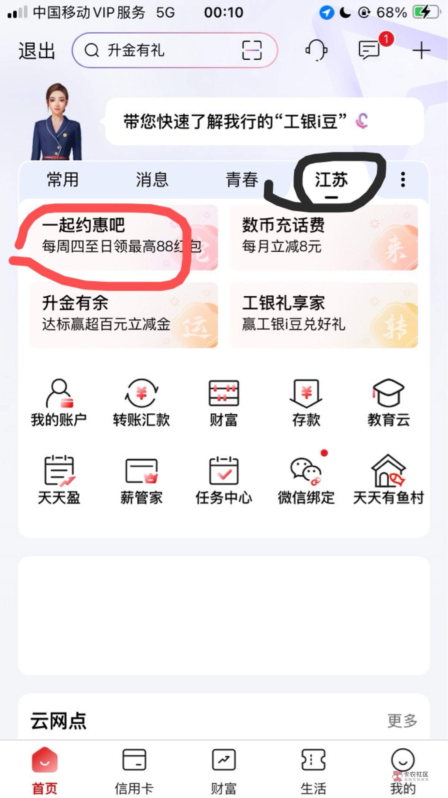 工行江苏一起约惠吧储蓄卡1.08元活动