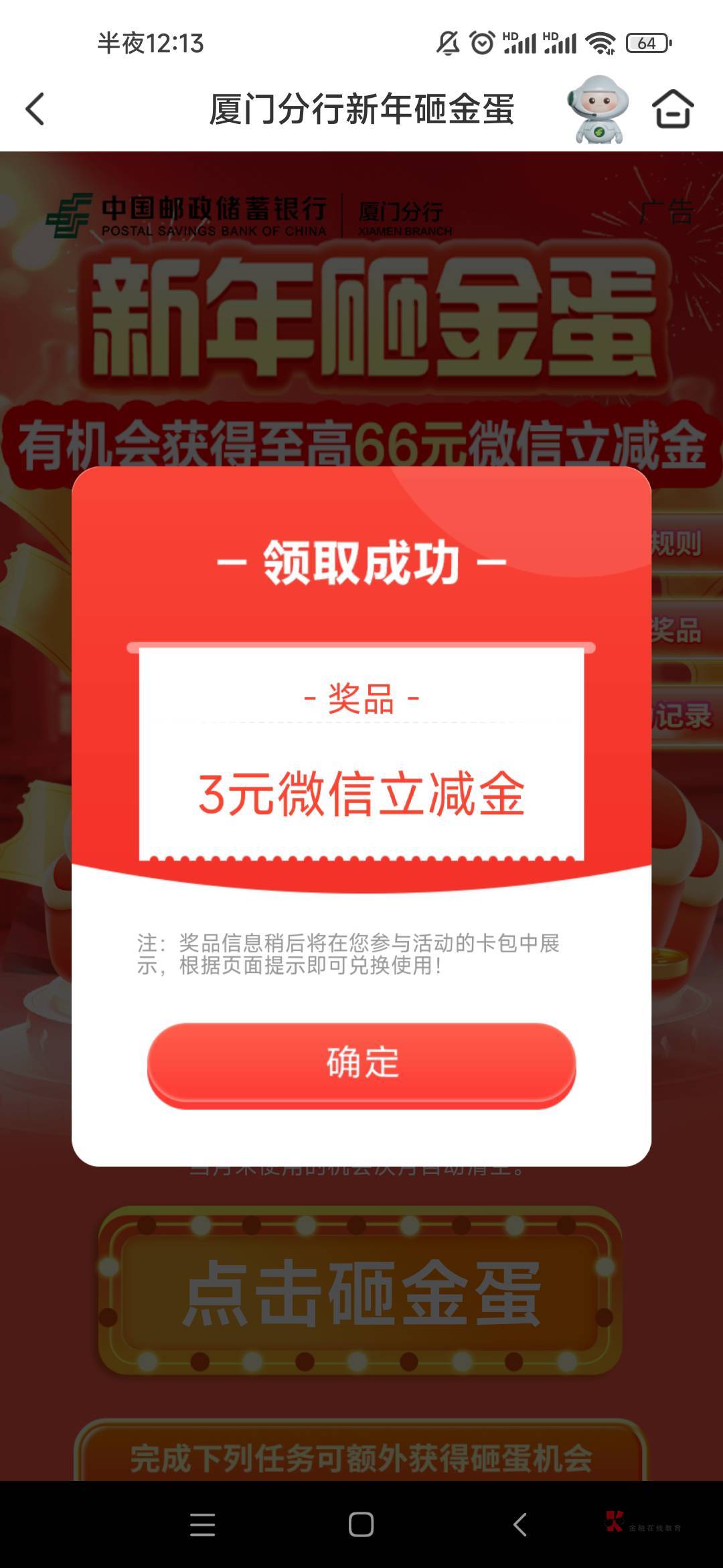 厦门邮储新年哪个活动 任务刷新了