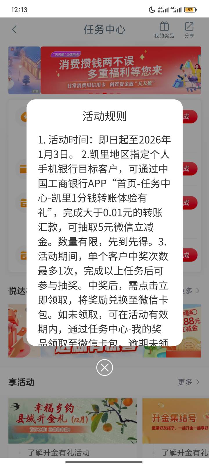 工行任务中心凯里1分钱转账体验有礼活动