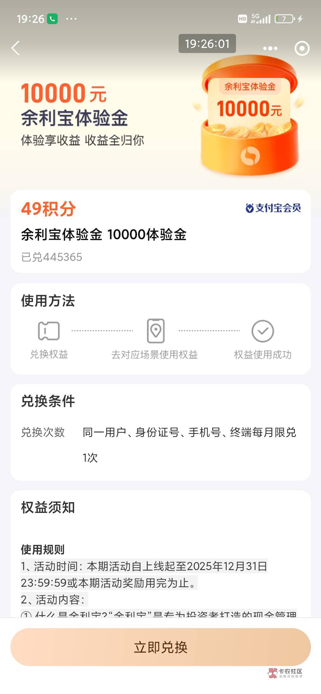 支付宝积分兑换10000余利宝体验金