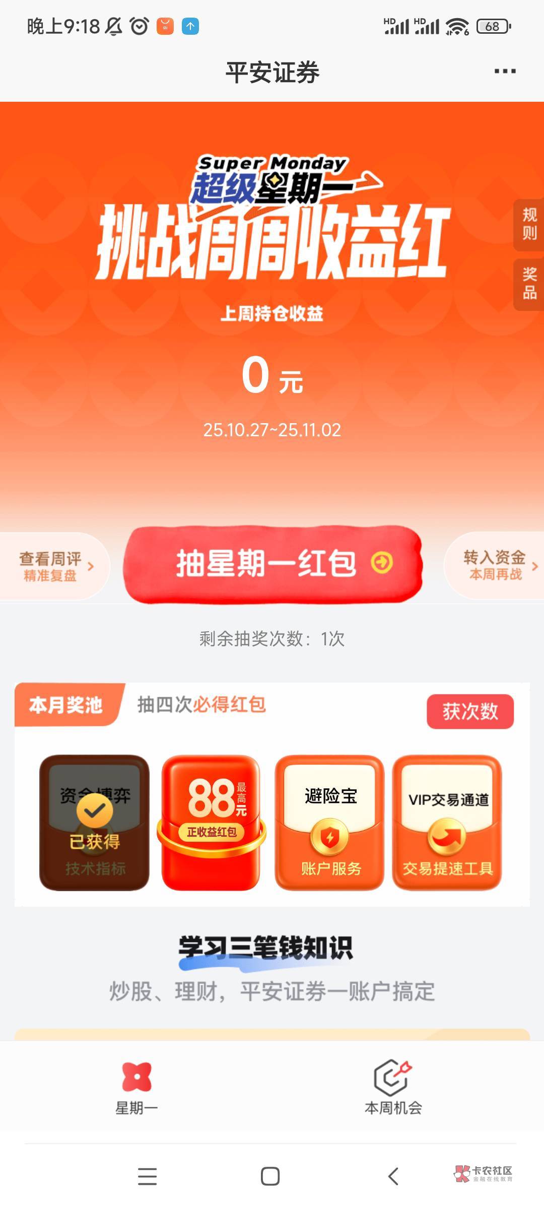 平安证券这个月没参加星期一的,现在把这个礼拜第一次的奖抽了,12点后就可以抽第二次红包了