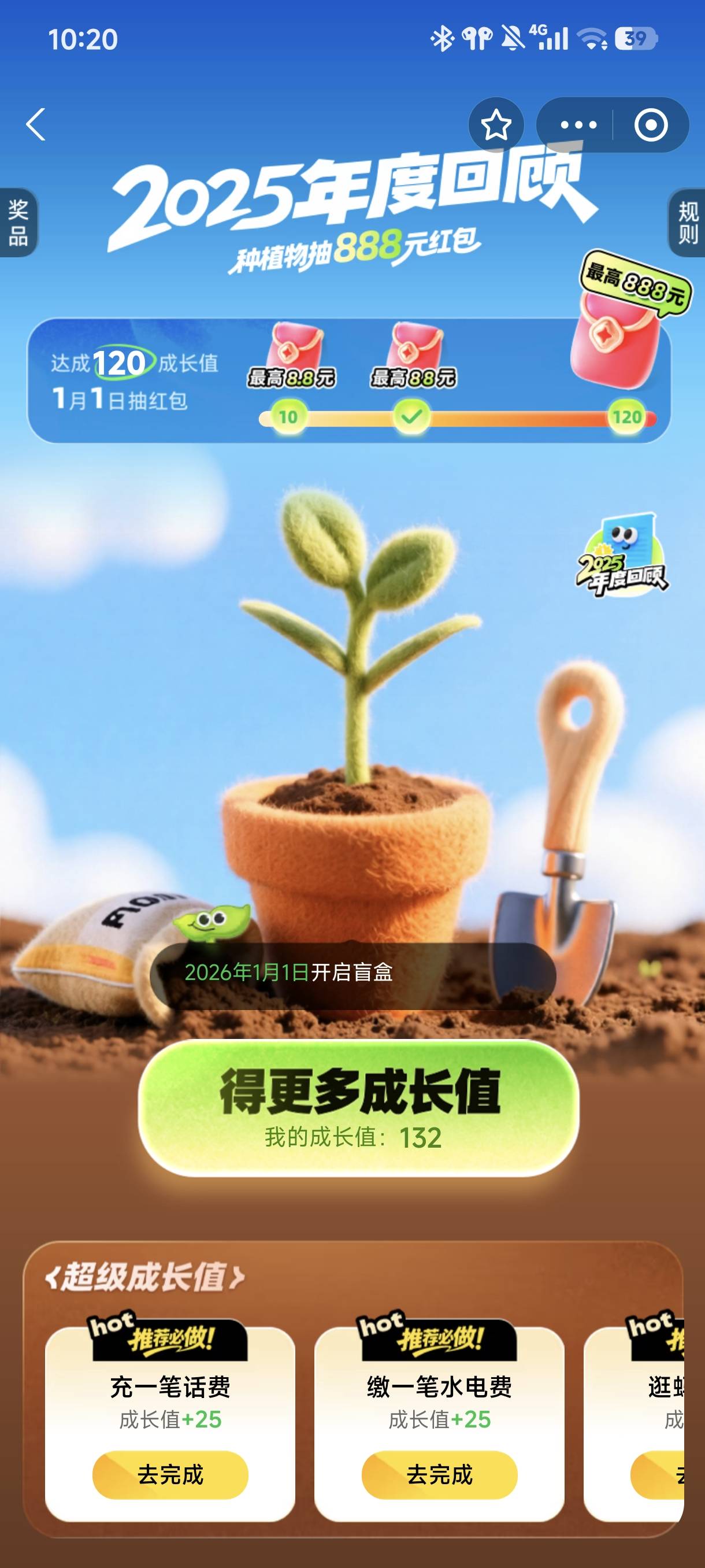 支付宝年度种植。最后一个包明天开奖。前两个做满点击今天开奖。不缺好运的。嫌少就别弄