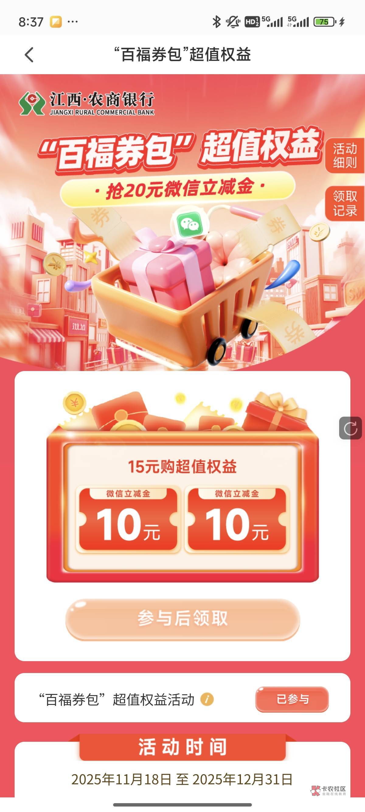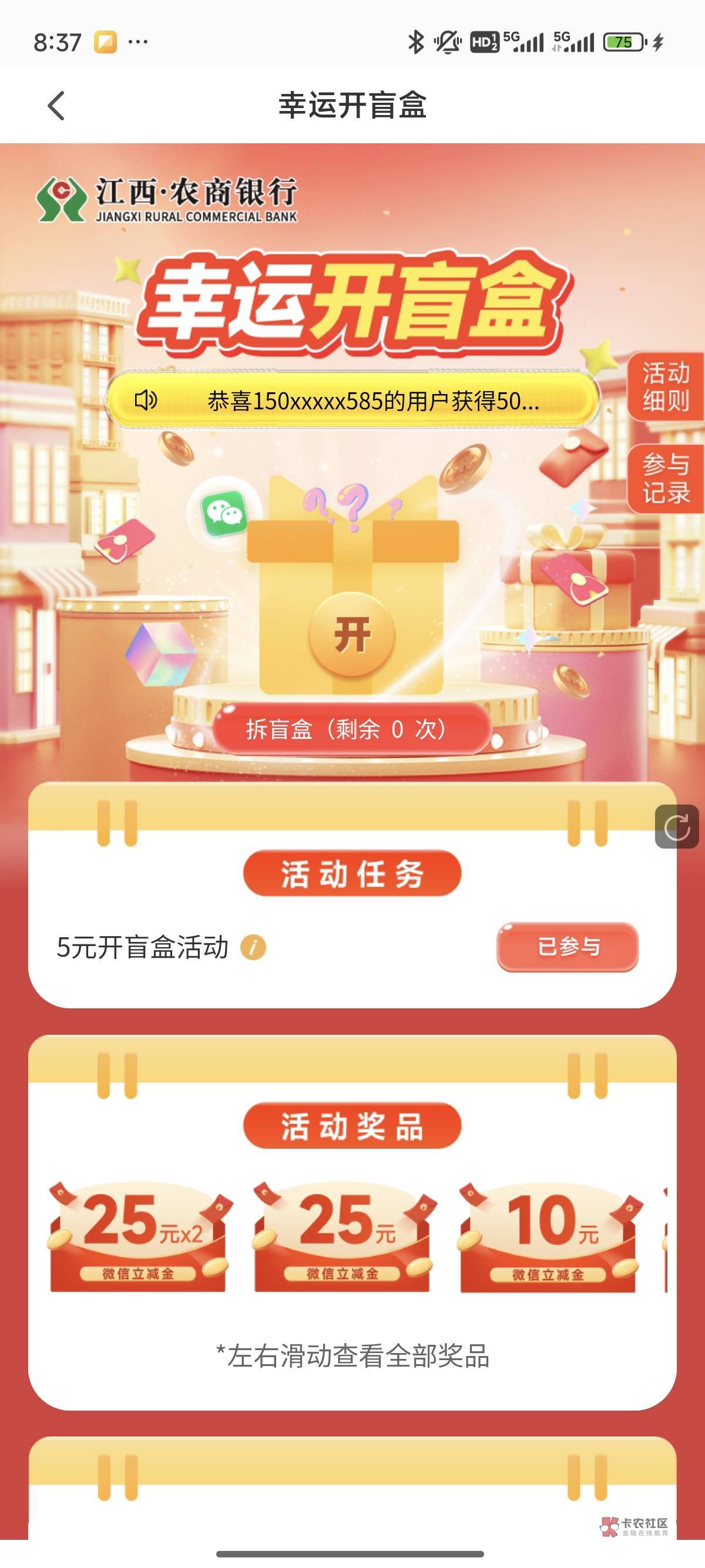 老哥们之前我发过这个羊毛,江西农商活动,无脑冲,15买20立减金买4次必润20,幸运盲盒支付5保底5,也有四次机会,今天中了个10的。加补买3次15买20立减,润20,有江西农商的冲一下