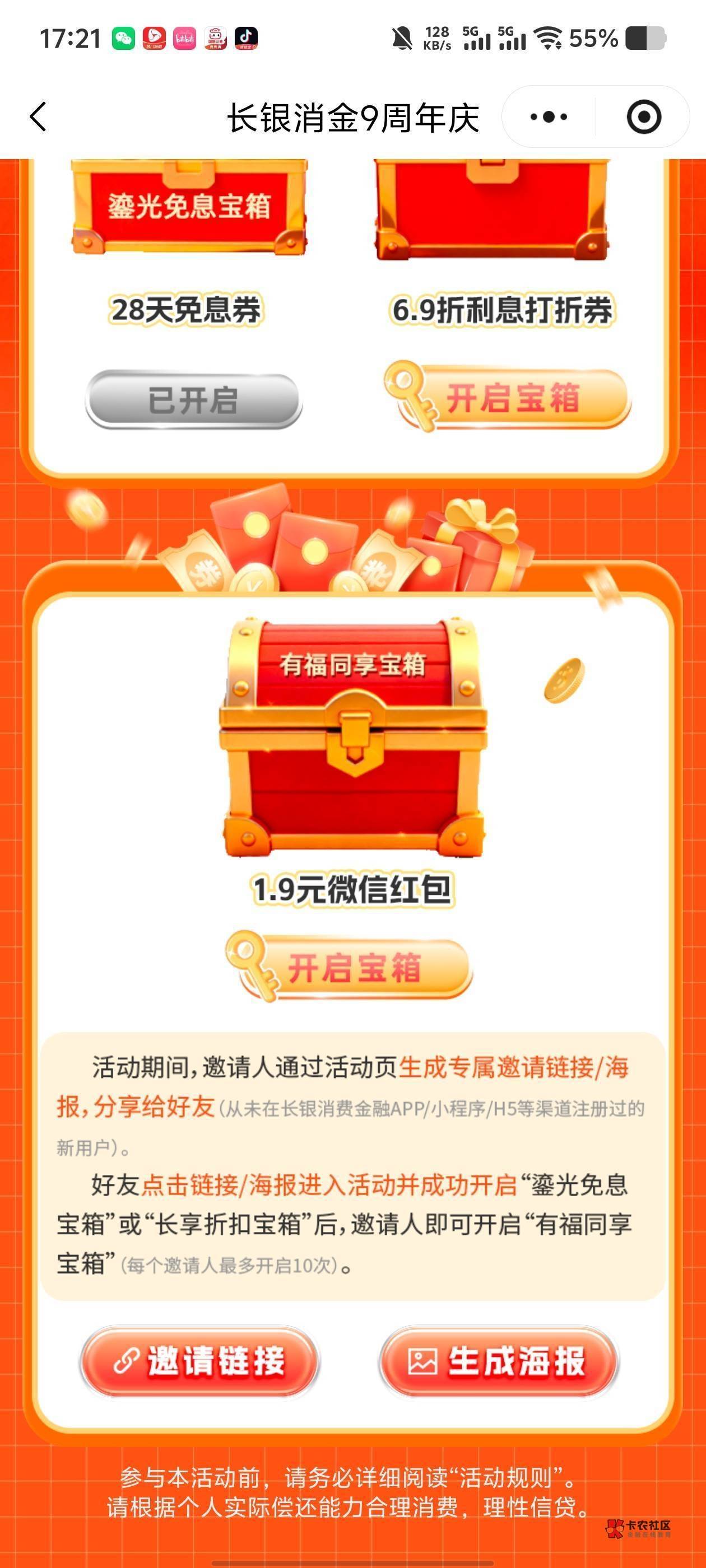 长银金融消费9周年一v19,多v多领,先用大号分享给小号,小号先去小程序登录登录好再点击邀请链接这时候提示你未登录,在点左上角从首页进,然后大号看浏览数据来了没有,没有多从邀请链接重复一下,出数据了小号再把宝箱打开,两个都宝箱都点一下确保数据达标了然后就能开1.9宝箱,然后小号退出重复接吗操作上限1v10人19毛,赶紧的错过不再来,大号在达标战绩那里等数据没有多重复操作,记住小号出浏览数据了再去开小号宝箱才能达标