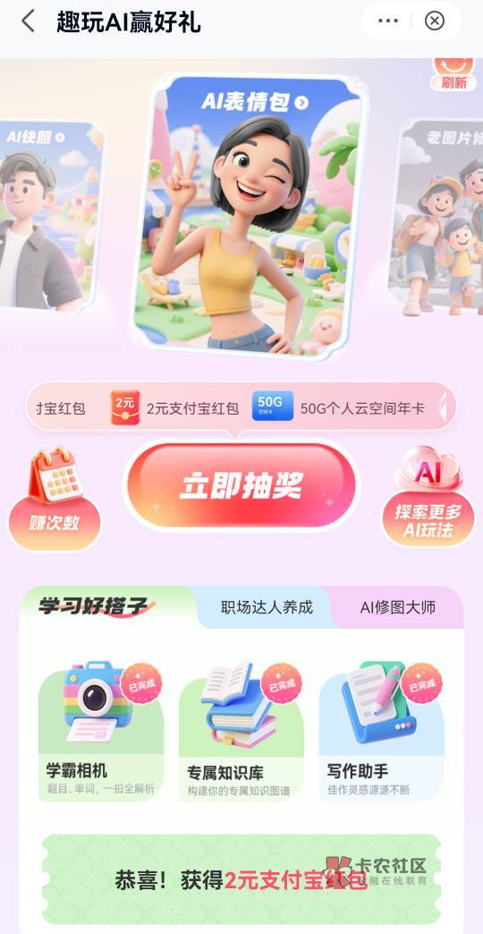 老的羊毛,移动云盘,活动中心,趣味Ai没玩的去,做过的W视,任务每天3次抽奖机会,还