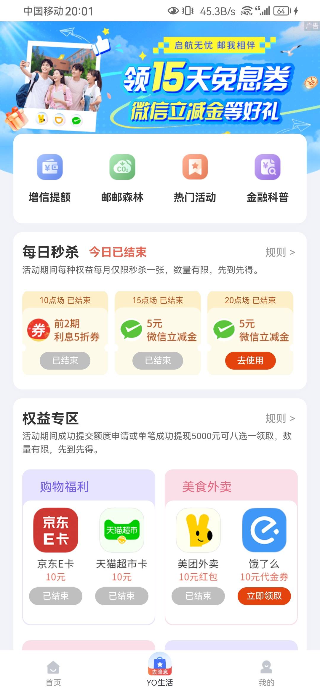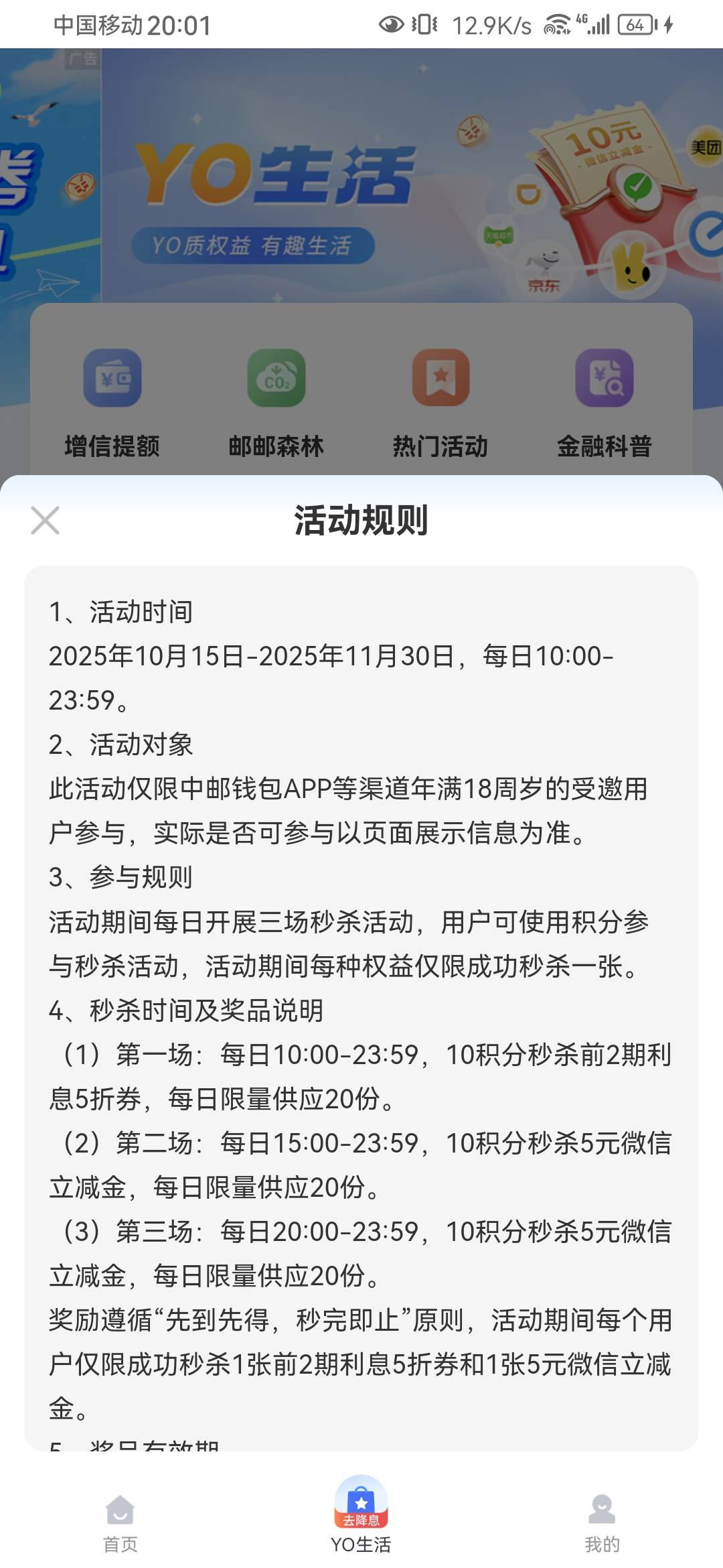 中邮钱包app,中间yo生活,中间可以抢5元立减金,每天两场,看日期可能是老羊毛,没玩的可以去玩