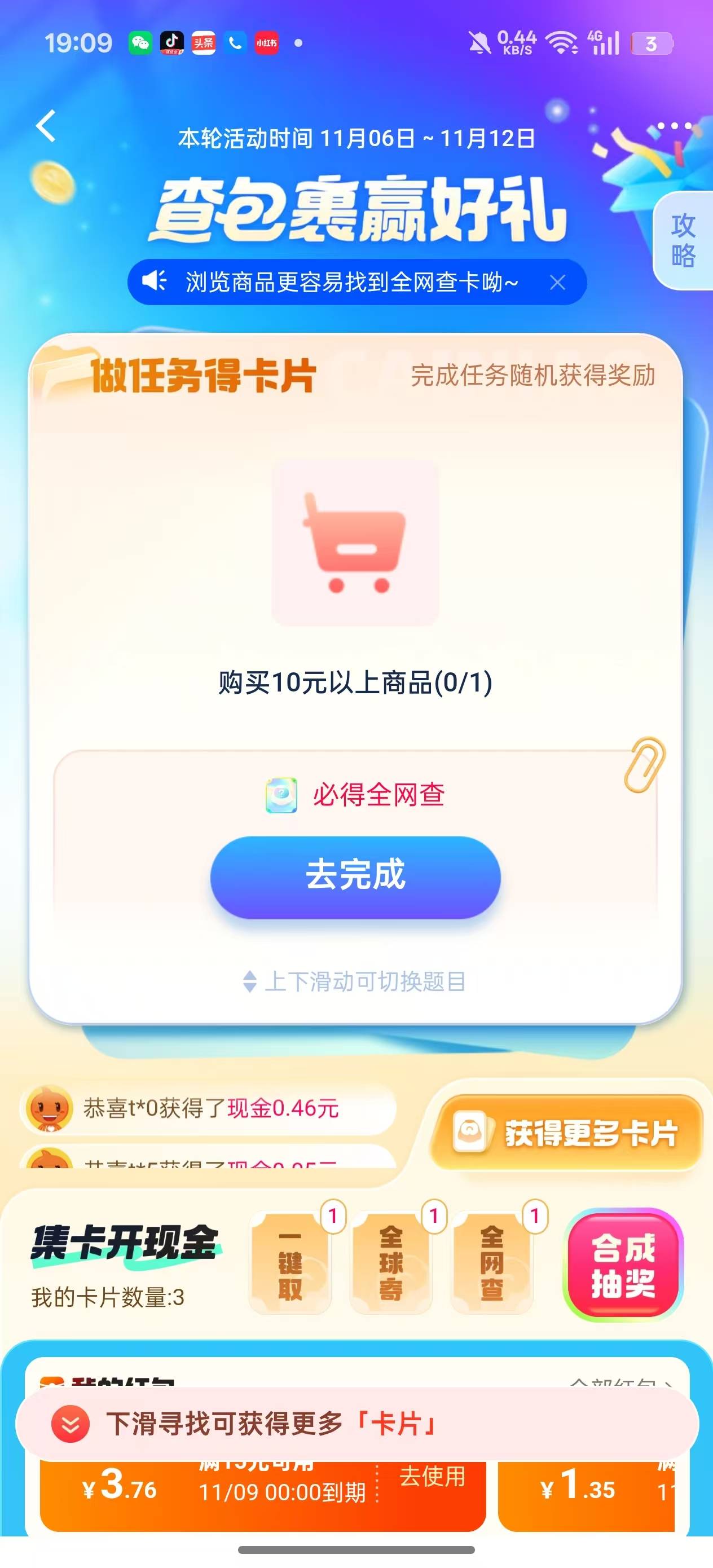 菜鸟app首页包裹赚赚点进去集卡抽奖 全网查卡越多中的现金越大 记得绑定支付宝 一