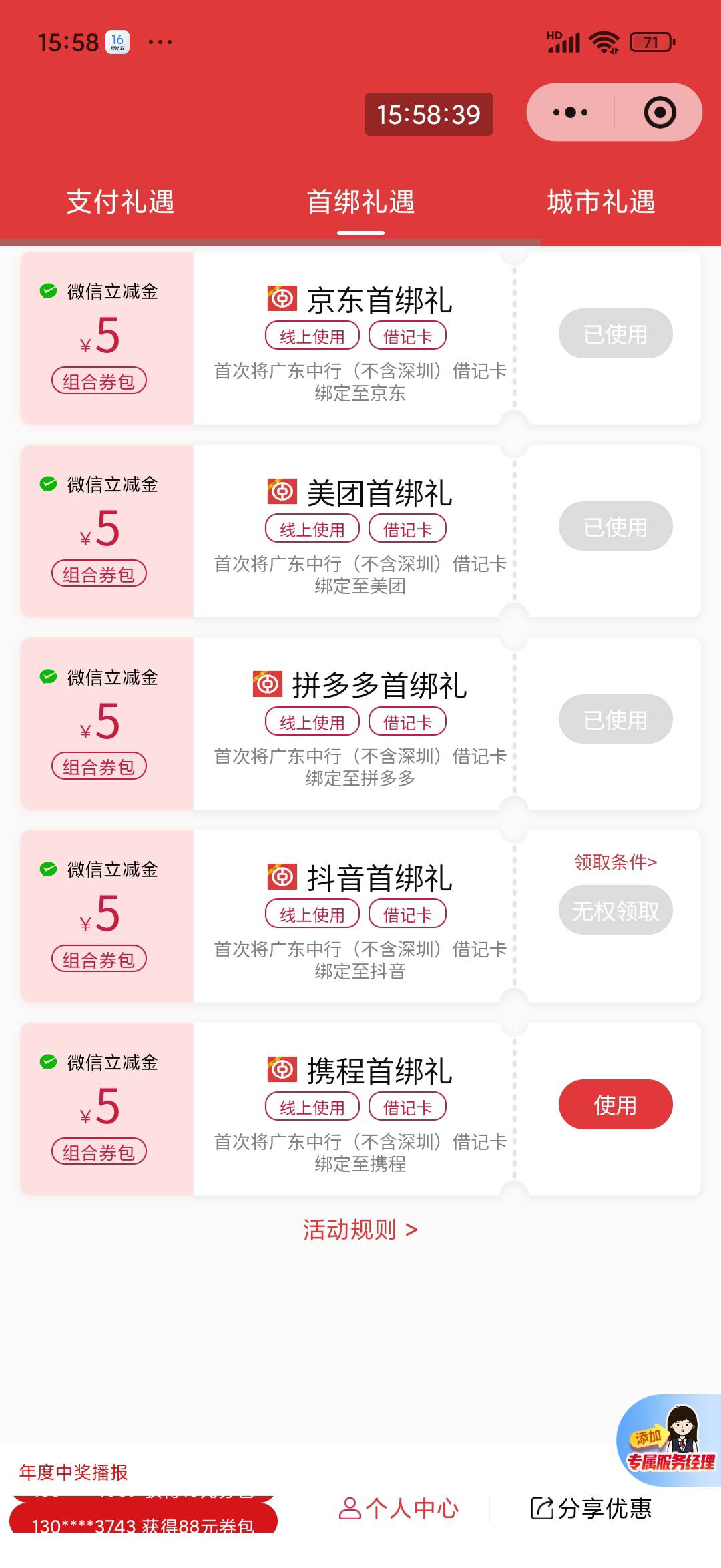 广东中行尊享有礼小程序多了个携程首绑,没绑过去中行搜一键绑卡将广东中行卡绑定到携程,过3天达标领5立减金券包