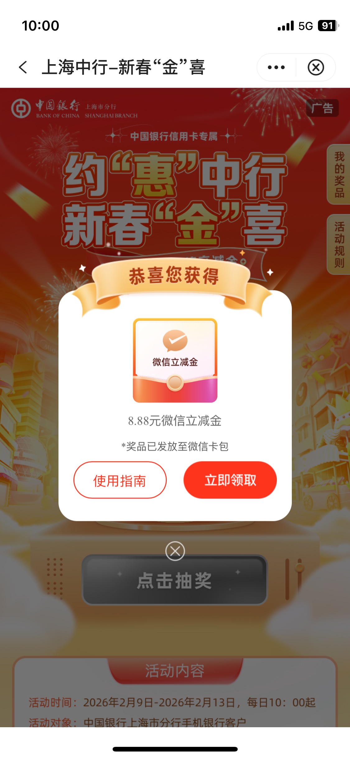 上海中行,本地优惠,约惠上海,新春专属,信用卡,直接到卡包了