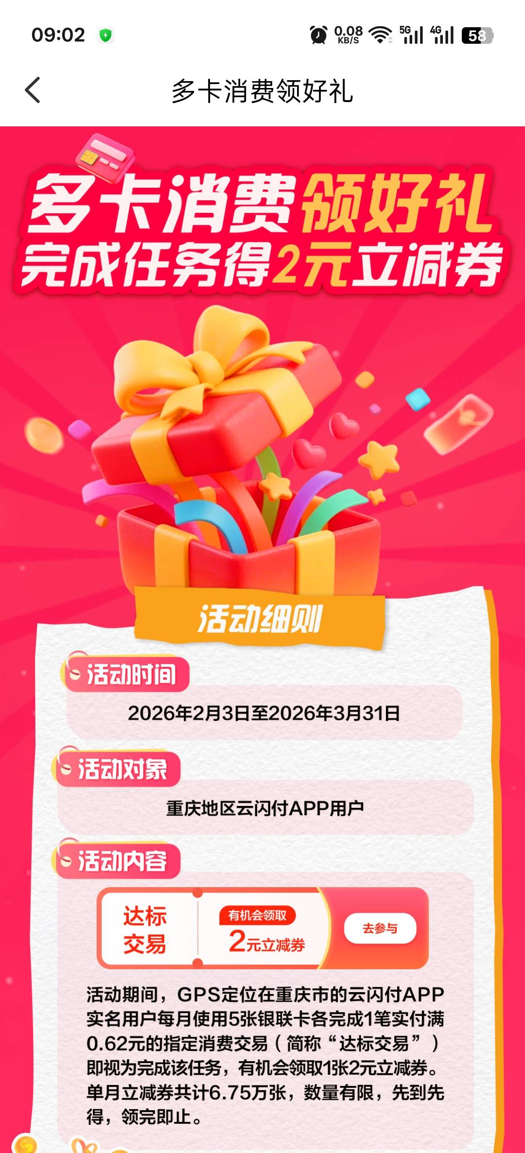 重庆云闪付多卡支付领2元立减券活动