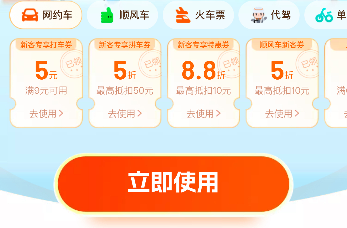 滴滴5折,火车票-101、滴滴5折2、火车票-10(机票无门槛-88)