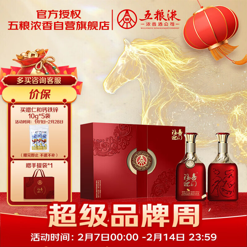 ——春节不打烊——【自营】五粮液 福喜迎门浓香型白酒52度500ml*2瓶https://u.jd.com/lagoAAR178元,自留送礼都很不错*赠仁和维生素D3 5袋 礼盒装
