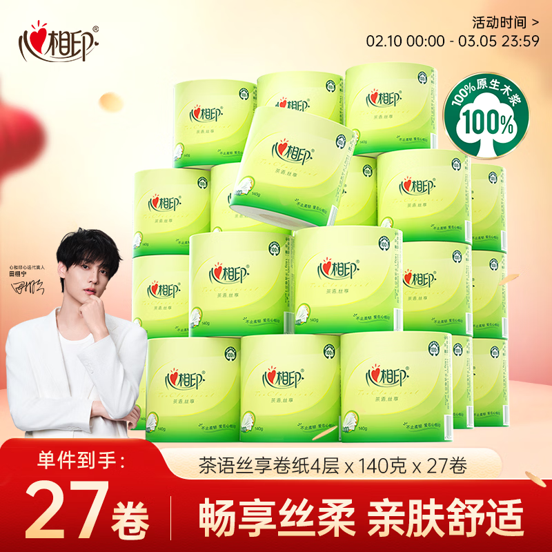 ——心相印春节不打烊——茶语丝享有芯卷纸140g*27卷https://u.jd.com/lGpCHy538.8元自营包邮,Plus35.1*折1.3/卷 4层加厚 遇水即溶