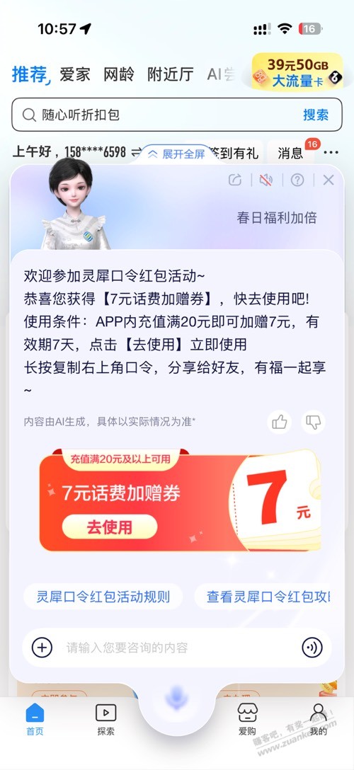 移动app给灵犀发送(春日福利加倍)领取话费券